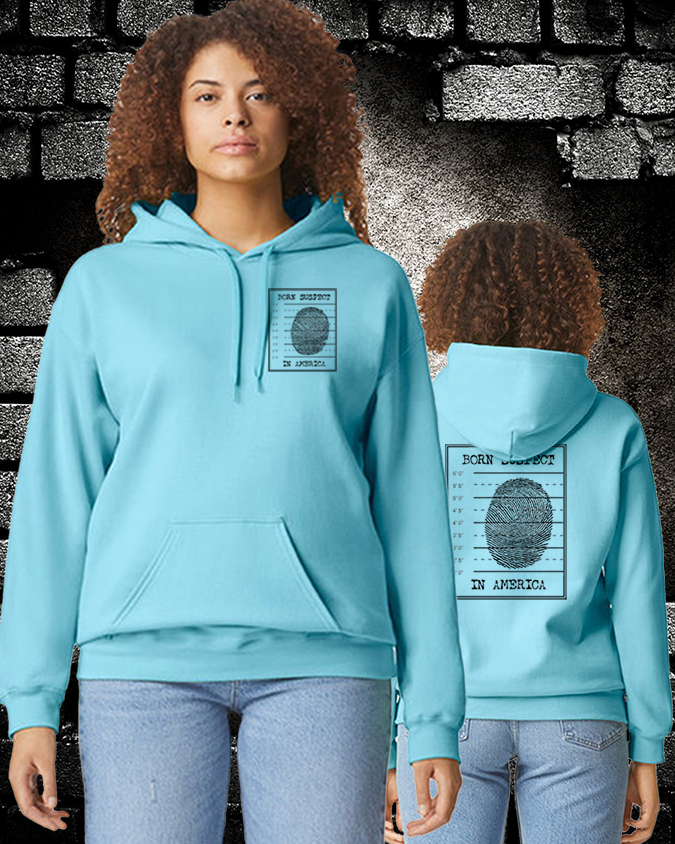 This is a 9oz. polyester hoody with a screen printed Classic Born Suspect(TM) logo on front chest and on back.